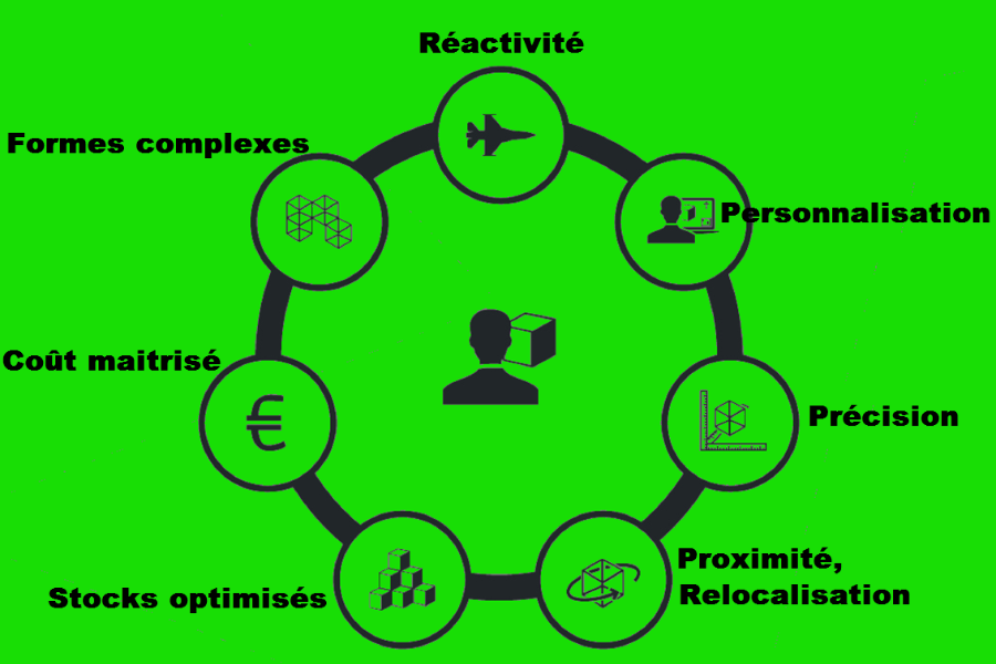 aux contraintes metiers et aux évolutions de la fabrication additive: Sélection des matériaux et de leurs contraintes techniques et normées, choix coordonné des logiciels, scanners, imprimantes, consommables. Gestion des finitions et des chutes. Formation des opérateurs.
